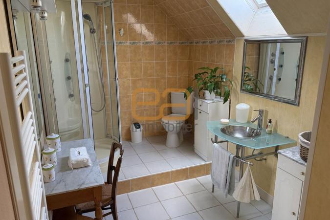 A l’étage, un pallier dessert deux chambres, un bureau, une salle d’eau avec WC et un grenier isolé.