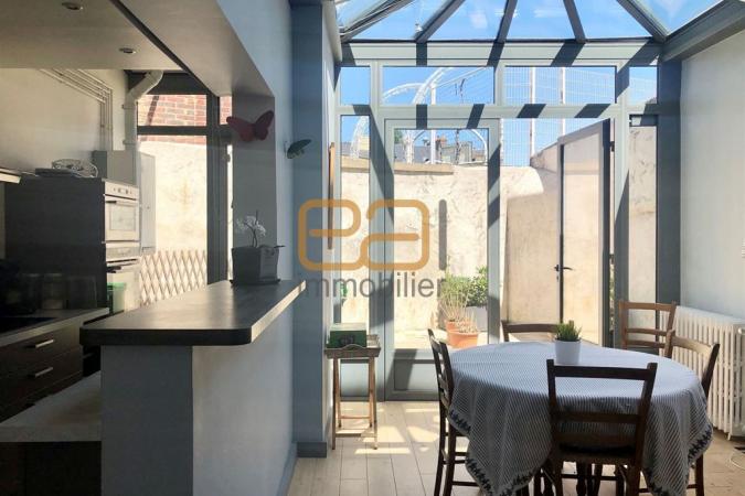 Au rez-de-chaussée : double salon et cuisine ouverte sur une salle à manger lumineuse sous verrière et son patio (20m2), un wc.