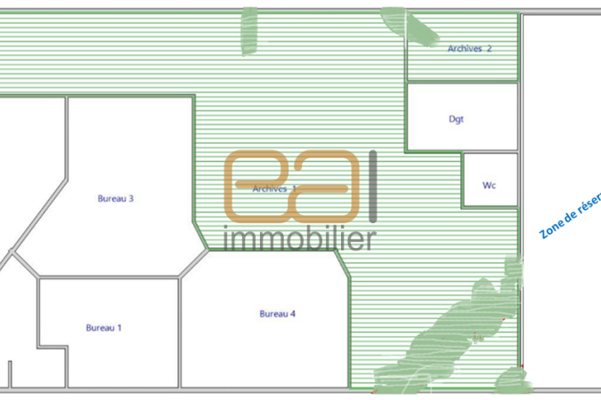 Le bâtiment est à usage de local commercial, disponible et bon état général, composé d'une entrée avec accueil, 4 bureaux, un coin cuisine, salle d'eau et sanitaires avec douche. Une zone servant de stockage + pièce d'archives. (278m² chauffé et 365m² sur son intégralité).