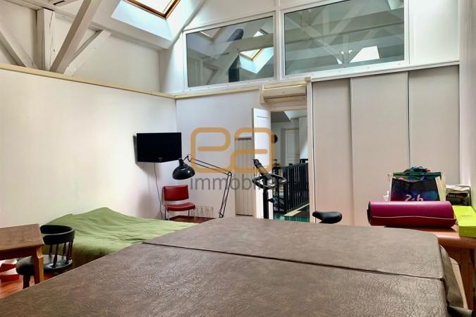 Véritable loft au sens propre du terme, ce logement a été aménagé dans un ancien atelier/entrepôt. Cette configuration offre des espaces entièrement ouverts et permet d’obtenir ainsi des volumes dégagés et éclairés, dans le cas présent par des fenêtres de toit. L’espace de vie de 90 m² environ dévoile une vaste entrée menant à un ensemble spacieux et élégant comprenant un salon, une salle à manger, et une cuisine aménagée et équipée avec îlot central. Un bureau de 21m² environ en contrebas de quelques marches (aménageable en chambre supplémentaire, voire en piscine intérieure), un WC indépendant avec son point d’eau et un local technique complètent ce niveau.