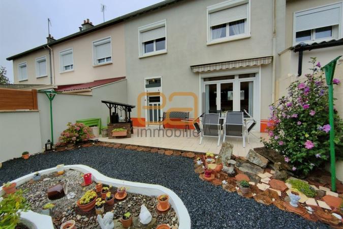 Cette maison de 65m2 en excellent état, est composée comme suit : une entrée qui dessert la cuisine aménagée et équipée ouverte sur le séjour qui offre un accès direct à l'extérieur (cour et terrasse), un garage qui comprend une partie buanderie, à l'étage trois chambres, un placard, une salle d'eau, WC séparés.