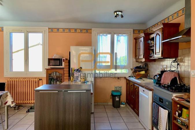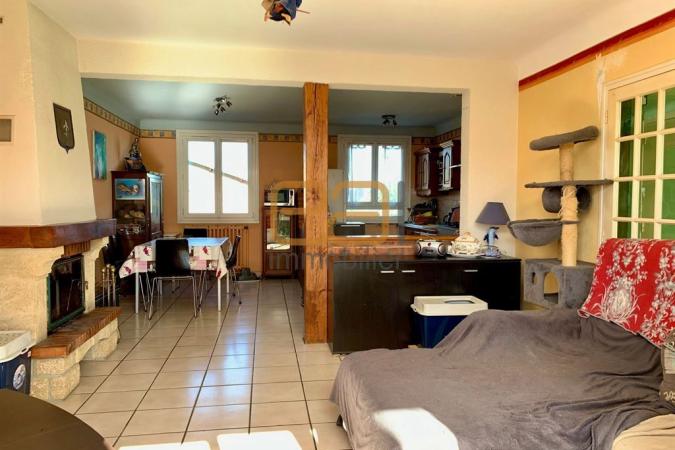 La partie habitation débute par une entrée de type véranda de 7m² qui mène à la pièce de vie de 35m², composée d’un séjour avec cheminée à insert fermé et d’une cuisine américaine aménagée et équipée. L’espace nuit comprend 4 chambres de respectivement 12/10/9,5 et 9m², une salle de bains à refaire et un WC indépendant. Le sous-sol est constitué d’un garage de 35m², d’une chaufferie de 6m² et d’une buanderie ou cuisine d’été de 18m². Une pièce supplémentaire de 22m², qui peut être une chambre supplémentaire ou une pièce pour les loisirs, complète le niveau.