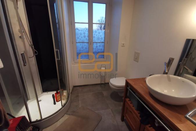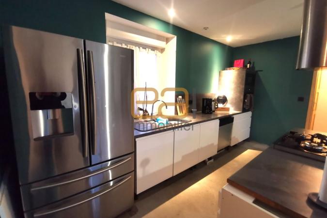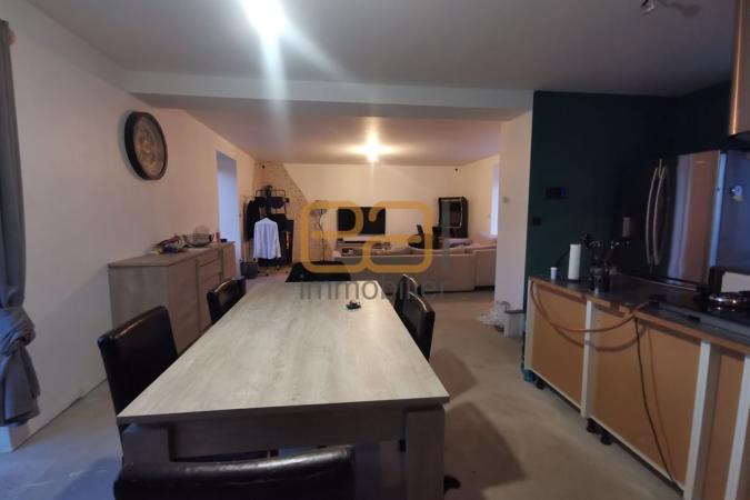 Vous disposerez d'un séjour double avec poêle à granulés, cuisine ouverte aménagée / équipée, vestiaire avec wc.