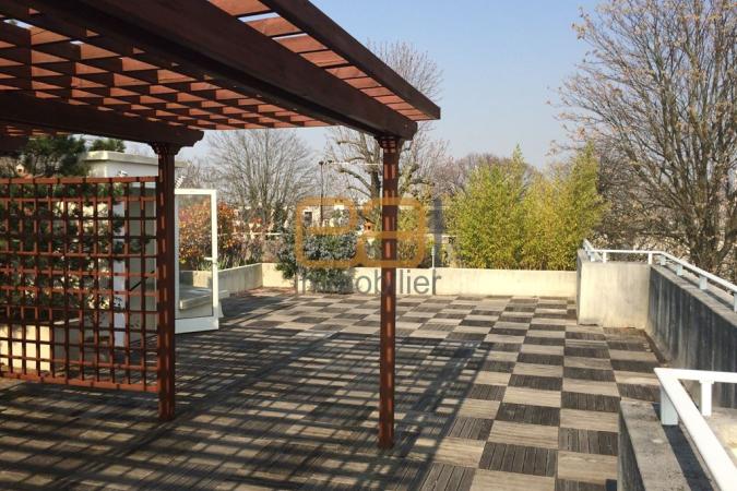 Suresnes - Mont Valérien, dans un immeuble en R+2, au dernier étage, appartement 5 pièces comprenant: entrée, cuisine aménagée, double séjour, trois chambres, deux salles de bains dont une avec WC, WC séparés. Accès au toit terrasse de plus de 120m2, exposition à 360°. Cave, box et emplacement de parking extérieur. Rare !