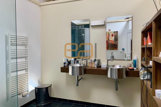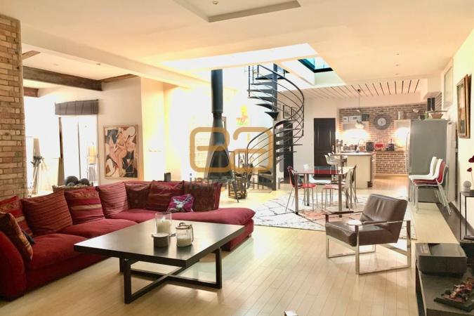 Véritable loft au sens propre du terme, ce logement a été aménagé dans un ancien atelier/entrepôt. Cette configuration offre des espaces entièrement ouverts et permet d’obtenir ainsi des volumes dégagés et éclairés, dans le cas présent par des fenêtres de toit. L’espace de vie de 90 m² environ dévoile une vaste entrée menant à un ensemble spacieux et élégant comprenant un salon, une salle à manger, et une cuisine aménagée et équipée avec îlot central. Un bureau de 21m² environ en contrebas de quelques marches (aménageable en chambre supplémentaire, voire en piscine intérieure), un WC indépendant avec son point d’eau et un local technique complètent ce niveau.