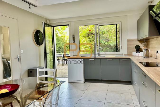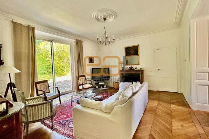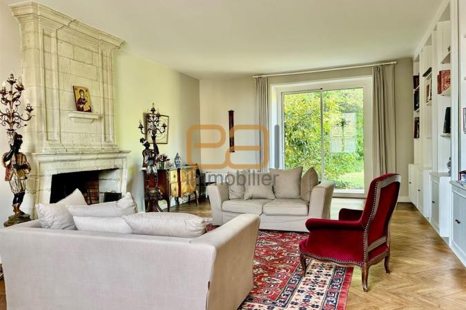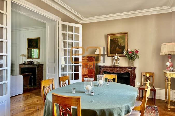 Au fil des trois niveaux, la demeure dévoile une collection d’éléments architecturaux d’une grande noblesse, avec notamment des parquets en chêne en point de Hongrie, des cheminées en marbre, des carreaux de ciment et des moulures d’origine. Dès le seuil, l’atmosphère s’impose : une vaste entrée ouvre sur le Grand Salon, véritable pièce de réception, tandis qu’à droite se déploient le Petit Salon et la salle à manger, harmonieusement reliés, alliant confort du quotidien et élégance des circulations. Dans le prolongement, une cuisine lumineuse, dinatoire, aménagée et équipée, agrémentée d’un puits de lumière, vient sublimer les instants gourmands. Une aile en contrebas, à l’abri des regards, complète ce niveau et propose une buanderie, un WC indépendant et une remise.